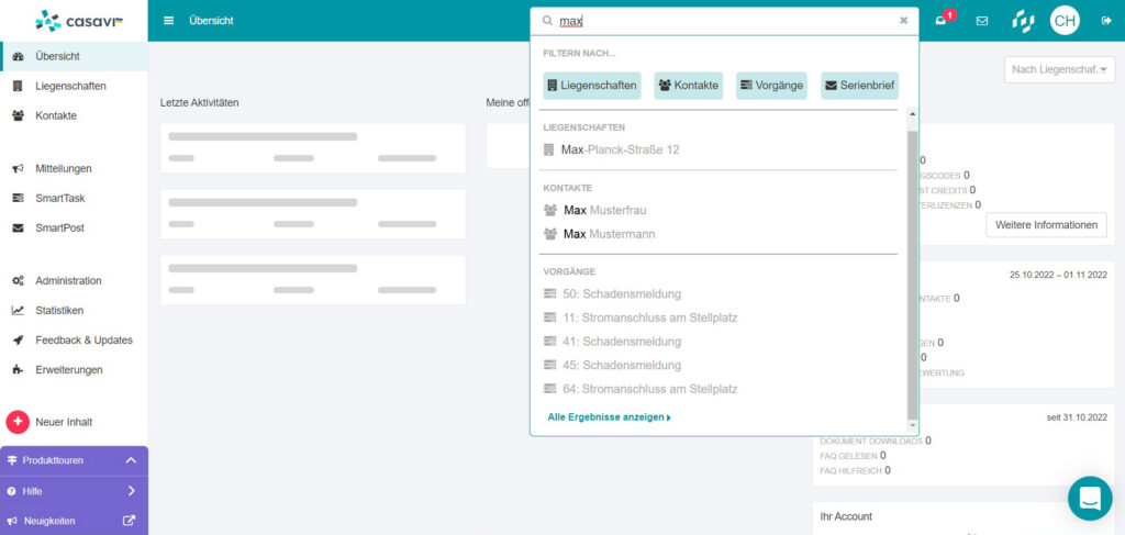 Wie alle Funktionen bei casavi entwickeln wir natürlich auch die globale Suche stetig weiter. Hierfür freuen wir uns auf Ihre Ideen und Ihr Feedback, wie Sie die Suchfunktion in Zukunft noch intensiver nutzen würden.