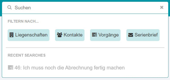Um eine Suchanfrage zu starten, wählen Sie bitte in der oberen Leiste das Suchfeld aus. Anschließend öffnet sich die Suchmaske, wo Sie nach bestimmten Kategorien filtern können oder aber Ihnen werden auch Ihre letzten Suchanfragen angezeigt.