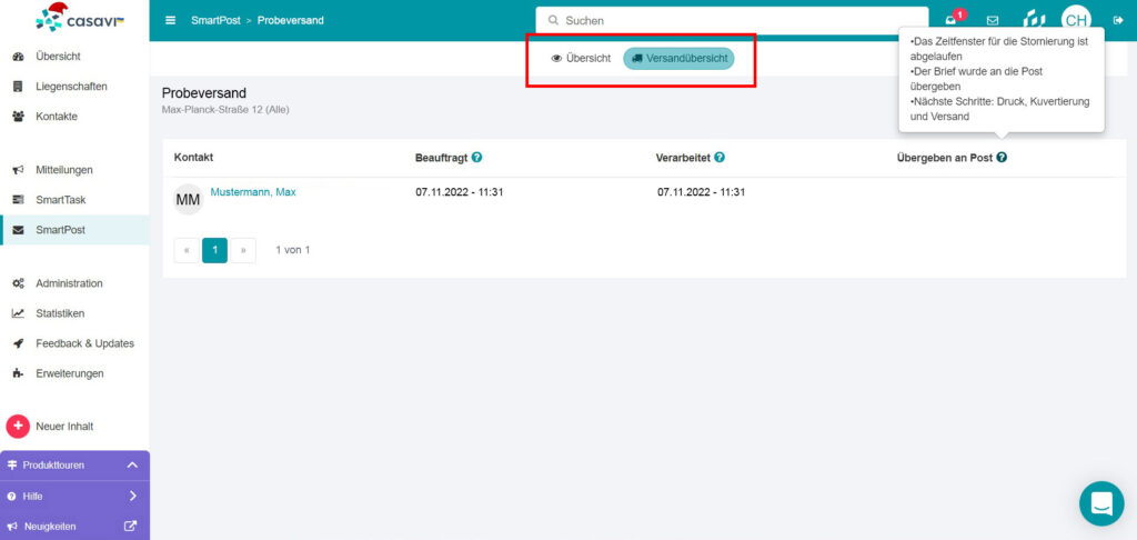 Die Versanddetails bei der SmartPost werden jetzt detaillierter angezeigt. Bisher konnten Sie nur sehen, ob Ihre Sendung verschickt wurde oder nicht und welche Bewohner:in Ihren Brief digital oder per Post erhalten hat. Um den internen Prozess für Sie greifbarer zu gestalten und um zu sehen, an welcher Stelle eine Auftragsstornierung möglich wäre, wurde eine weitere Übersichtsseite eingerichtet. Wählen Sie dazu eine SmartPost-Sendung aus und klicken Sie unterhalb der Suchleiste auf „Versandübersicht“.