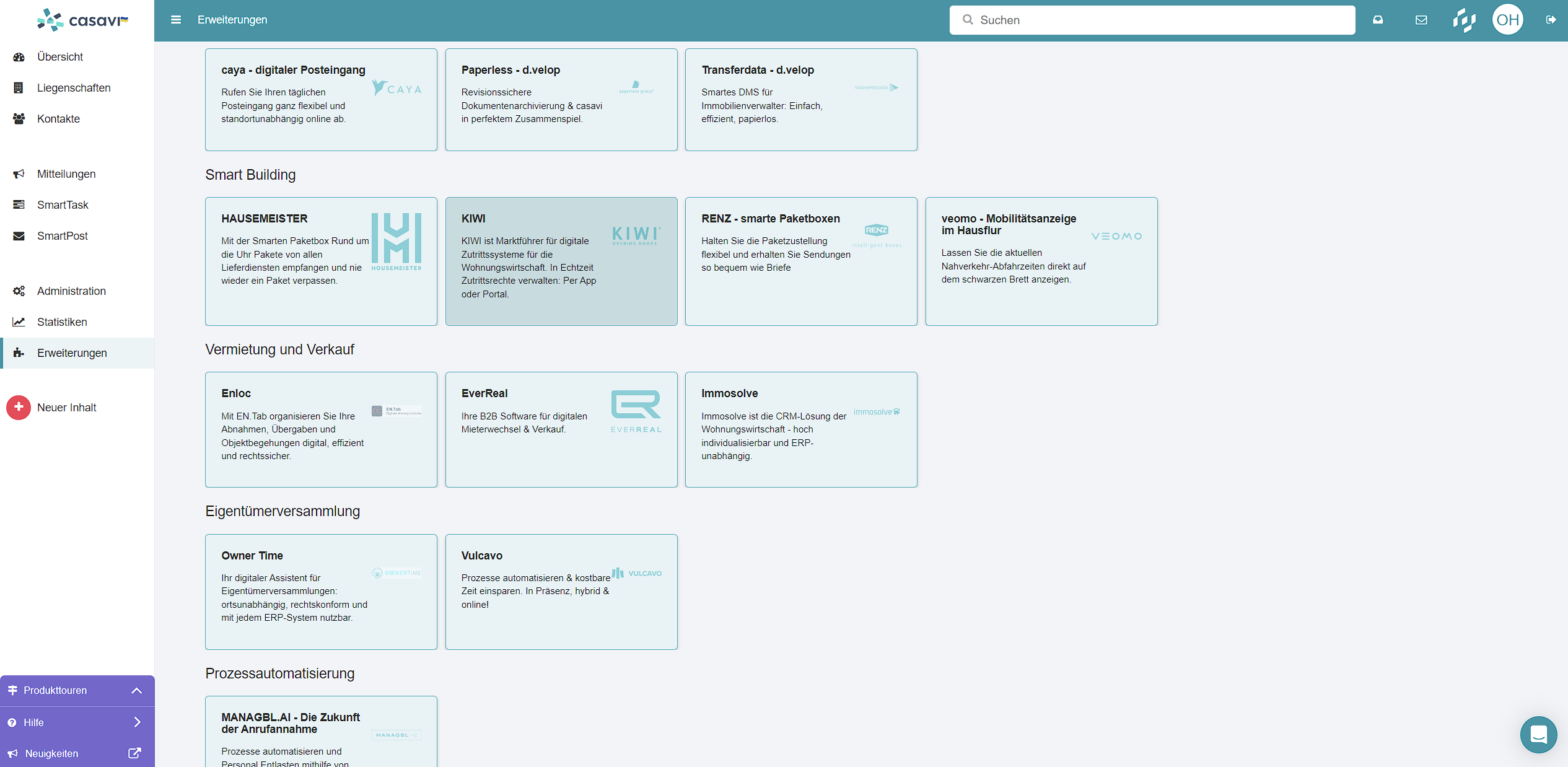 Mit dem letzten Update haben wir den Reiter „Erweiterungen“ in der Navigation überabeitet: In der Übersicht finden Sie jetzt alle Lösungen aus dem casavi Partnernetzwerk. So können Sie sich zu weiteren Schritten in der ganzheitlichen Digitalisierung Ihrer Verwaltung inspirieren lassen. Sei es die Auswahl eines neuen ERP-Systems, die Digitalisierung Ihres Posteingangs oder eine revisionssichere Dokumentenablage und vieles mehr: In der Übersicht finden Sie ein breites Angebot an Software-Anbietern, die casavi passend ergänzen oder sogar technische Schnittstellen nutzen.